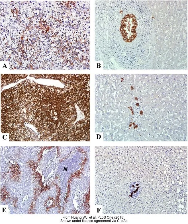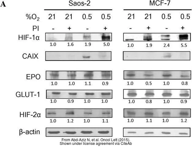 Carbonic Anhydrase IX antibody (CA9 antibody) detects carbonic anhydrase 9, a ~50 kDa transmembrane glycoprotein. CA9 expression is enhanced by HIF1-alpha signaling in various biological processes, including cell proliferation and transformation. Found in many tissues, CA9 overexpression promotes tumor growth in various cancers.
