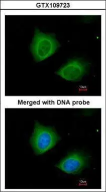 Immunofluorescence analysis of paraformaldehyde-fixed HeLa, using Cytokeratin 7(GTX109723) antibody at 1:200 dilution.