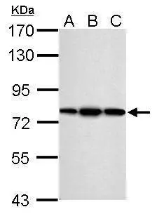Various whole cell extracts (30 μg) were separated by 7.5% SDS-PAGE, and the membranes were blotted with ERP72 antibody (GTX115263) diluted at 1:500 and competitor's antibody diluted at 1:500. The HRP-conjugated anti-rabbit IgG antibody (GTX213110-01) was used to detect the primary antibody.