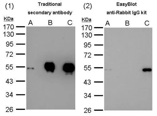 EasyBlot anti-Rabbit IgG is an HRP-conjugated second step reagent that specifically reacts with the native, non-reduced form of rabbit IgG and does not bind to the reduced, denatured form. Using Easyblot decreases the interference caused by the heavy (~50 kDa) and light chains (~25 kDa) of the IgG used for immunoprecipitation (IP).