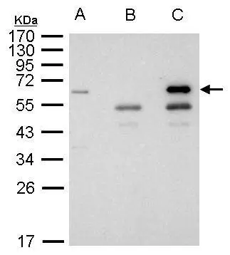 HDAC1antibody immunoprecipitates HDAC1 protein in IP experiments. IP Sample: 1000 μg 293T whole cell lysate/extract A. 40 μg 293T whole cell lysate/extract B. Control with 2.5 μg of preimmune rabbit IgG C. Immunoprecipitation of HDAC1 protein by 2.5 μg of HDAC1 antibody (GTX100513) 10% SDS-PAGE The immunoprecipitated HDAC1 protein was detected by HDAC1 antibody (GTX100513) diluted at 1:1000. EasyBlot anti-rabbit IgG (GTX221666-01) was used as a secondary reagent.