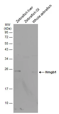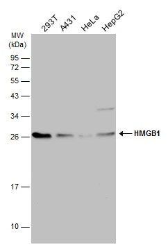 HMGB1 antibody detects HMGB1 protein by western blot analysis.