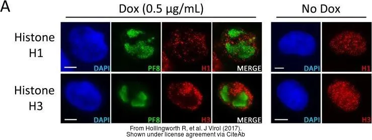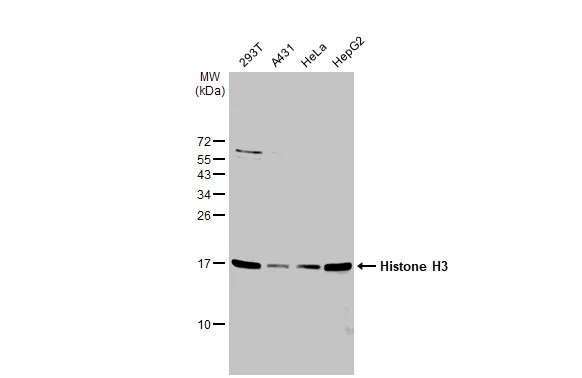Histone H3 antibody detects histone H3, a core component of the histone octamer in the context of the nucleosome. Like other histones, H3 is posttranslationally modified to impact epigenetic gene regulation. It is also highly conserved in eukaryotes, and therefore is used as an internal control for western blots or as a nuclear marker when conducting immunostaining.