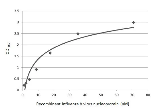 Sandwich ELISA detection of recombinant Influenza A virus Nucleoprotein protein (A/California/2009 (H1N1)), DDDDK Tag (GTX135904-pro) using antibodies as below. Capture: Influenza A virus Nucleoprotein antibody [HL1098] (GTX636282) (5 μg/mL) Detection: HRP-conjugated Influenza A virus Nucleoprotein antibody [HL1103] (GTX636318) (1 μg/mL)Please notice that GTX636318 needs to be conjugated to HRP to function as the detection antibody when paired with GTX636282. Please contact us for custom HRP-conjugated antibody.