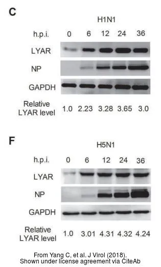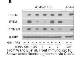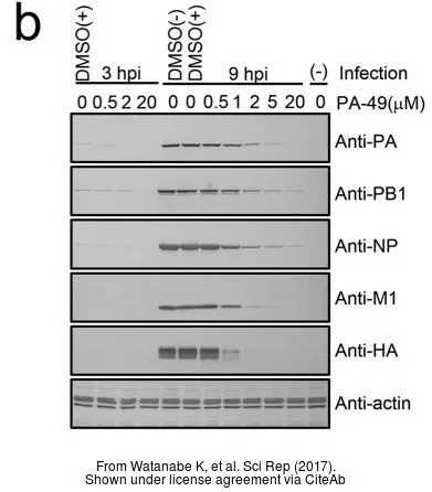 Non-infected (–) and infected (+) H1299 whole cell extracts (5 μg) were separated by 10% SDS-PAGE, and the membrane was blotted with Influenza A virus Nucleoprotein antibody (GTX125989) diluted at 1:10000. The HRP-conjugated anti-rabbit IgG antibody (GTX213110-01) was used to detect the primary antibody.