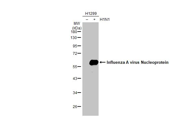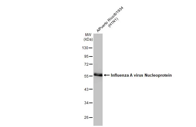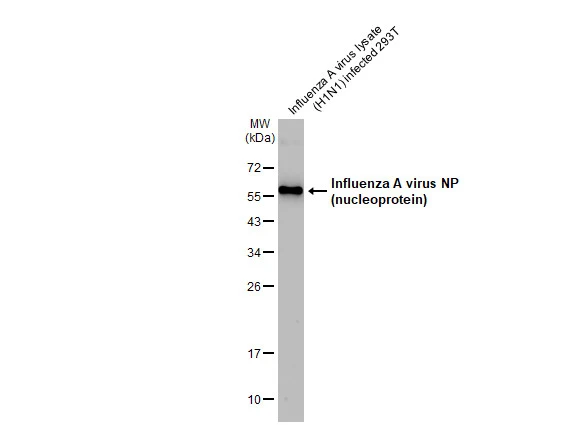 Influenza A virus lysate (H1N1) infected 293T whole cell extract was separated by 12% SDS-PAGE, and the membrane was blotted with Influenza A virus NP (nucleoprotein) antibody (GTX125989) diluted at 1:50000. The HRP-conjugated anti-rabbit IgG antibody (GTX213110-01) was used to detect the primary antibody.