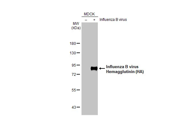 Non-infected (–) and infected (+) MDCK whole cell extracts (1 μg_MDCK | B/Taiwan/70555/05 μg) were separated by 7.5% SDS-PAGE, and the membrane was blotted with Influenza B virus Hemagglutinin (HA) antibody [HL2208] (GTX638212) diluted at 1:1000. The HRP-conjugated anti-rabbit IgG antibody (GTX213110-01) was used to detect the primary antibody.