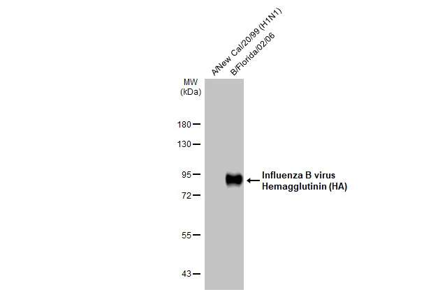 Influenza A (H1N1) amd Influenza B viral lysate were separated by 7.5% SDS-PAGE, and the membrane was blotted with Influenza B virus Hemagglutinin (HA) antibody [HL2208] (GTX638212) diluted at 1:1000. The HRP-conjugated anti-rabbit IgG antibody (GTX213110-01) was used to detect the primary antibody.
