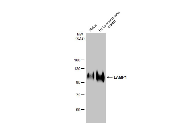 LAMP1 antibody detects lysosome-associated membrane protein 1 (LAMP-1, or CD107a), a transmembrane glycoprotein that generally migrates at ~120 kDa on western blot. LAMP1 and LAMP2 are major protein components of lysosomal membranes, though both proteins appear to have a more dynamic distribution that includes endosomes, autolysosomes, and multivesicular bodies. Nevertheless, LAMP1 is often used as an indicator of lysosomes in cells.
