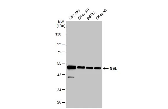 NSE is a 78 kDa gamma-homodimer expressed as a dominant enolase-isoenzyme in neuronal and neuroendocrine tissues. Elevated levels of serum NSE are often associated with neuronal disorders and neural crest-derived tumors. Up to 70 percent of patients with small cell lung carcinoma (SCLC) have high levels of serum NSE, as SCLC cells can express neuronal gene programs.