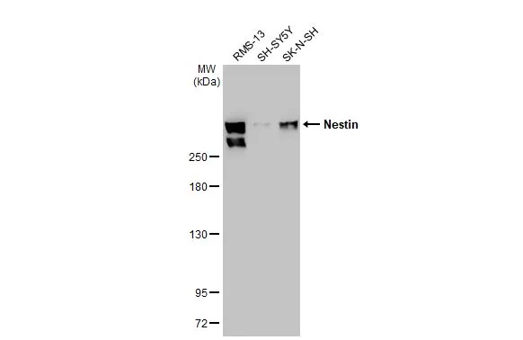 Nestin antibody recognizes nestin, a type-IV intermediate filament protein that migrates at ~240 kDa on western blot. Nestin is an established marker of mesodermal and neuroectodermal fates, and is expressed in neural stem cells. It is also enriched in endothelial cells, regardless of their proliferative state.