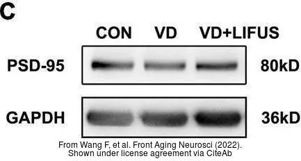 PSD95 antibody recognizes postsynaptic density protein 95, an ~80 kDa multidomain scaffold protein enriched at neuron postsynaptic excitatory membranes. It belongs to the membrane-associated guanylate kinase (MAGUK) family, which also contains PSD-93, SAP97 and SAP102. PSD95 is one of the most abundant proteins in the PSD, and functions in synapse maturation, strength, and plasticity.