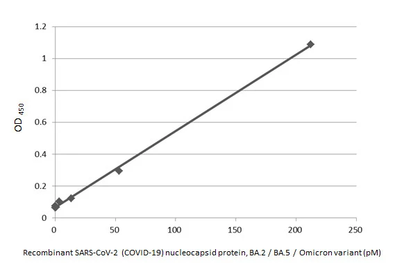 Sandwich ELISA detection of recombinant nucleocapsid protein(s) derived from different strains of SARS-CoV-2 virus (ie., Wild type; BA.2 / BA.5 Omicron variant) using antibodies as below. Capture: SARS-CoV-2 (COVID-19) nucleocapsid antibody [HL5511] (GTX635689) (5 μg/mL) Detection: SARS-CoV-2 (COVID-19) nucleocapsid antibody [HL448] (HRP) (GTX635686-01) (1 μg/mL)