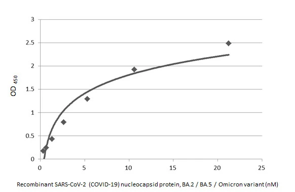 Indirect ELISA analysis was performed by coating the plate with recombinant SARS-CoV-2 (COVID-19) Nucleocapsid protein, Omicron / BA.2 / BA.5 variant, His tag (GTX137219-pro) (21.23-0.31 nM). Coated protein was probed with SARS-CoV-2 (COVID-19) nucleocapsid antibody [HL5511] (GTX635689) (1 μg/mL). Goat anti-rabbit IgG antibody (HRP) (GTX213110-01) (1:10000) was used to detect the bound primary antibody.