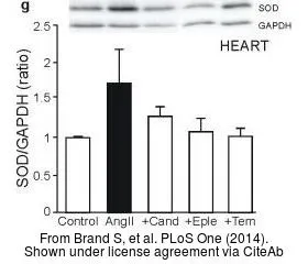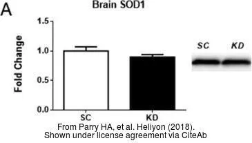 SOD1 antibody detects SOD1 protein by western blot analysis. Whole cell extracts (30 μg) was separated by 15% SDS-PAGE, and the membrane was blotted with SOD1 antibody (GTX100554) at a dilution of 1:1000. The HRP-conjugated anti-rabbit IgG antibody (GTX213110-01) was used to detect the primary antibody.