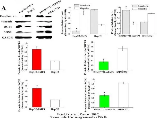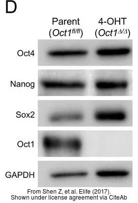 Whole cell extract (30 μg) was separated by 12% SDS-PAGE, and the membranes were blotted with SOX2 antibody [N1C3] (GTX101507) diluted at 1:1000 and competitor's antibody (sc-17320) diluted at 1:500. The HRP-conjugated anti-rabbit IgG antibody (GTX213110-01) was used to detect the primary antibody.