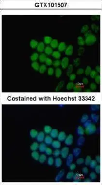 SOX2 antibody [N1C3] detects SOX2 protein at nucleus by immunofluorescent analysis.Sample: NT2D1 cells were fixed in 4% paraformaldehyde at RT for 15 min.Green: SOX2 stained by SOX2 antibody [N1C3] (GTX101507) diluted at 1:500.Red: phalloidin, a cytoskeleton marker, diluted at 1:100.Scale bar= 10 μm.