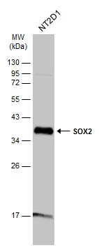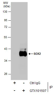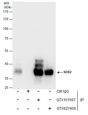 Immunoprecipitation of SOX2 protein from NT2D1 whole cell extracts using 5 μg of SOX2 antibody [N1C3] (GTX101507) or SOX2 antibody [GT1876] (GTX627404).