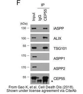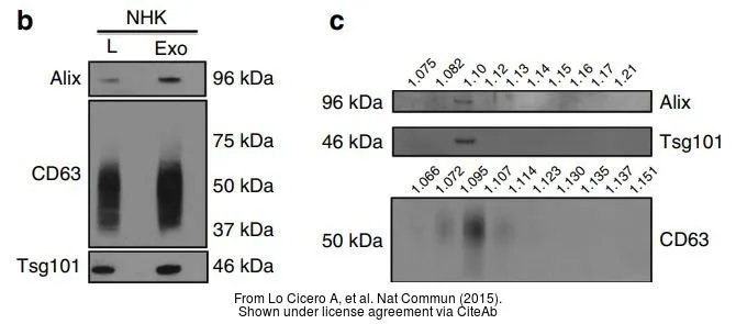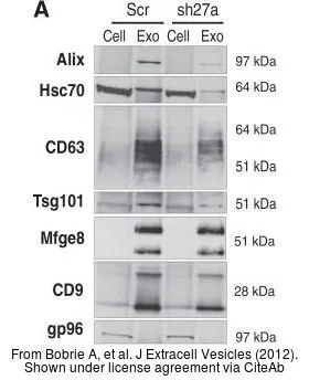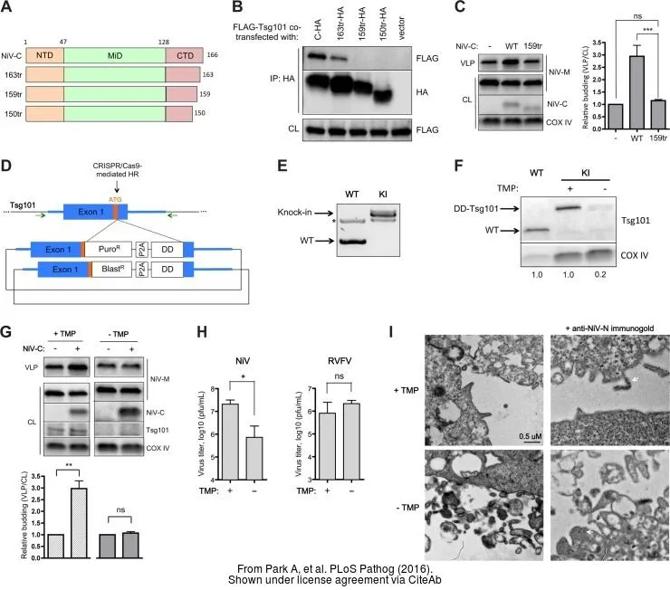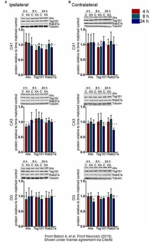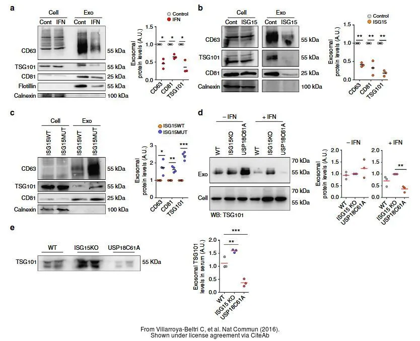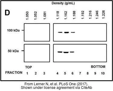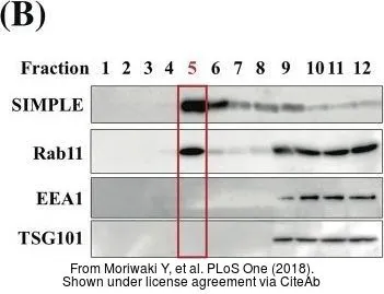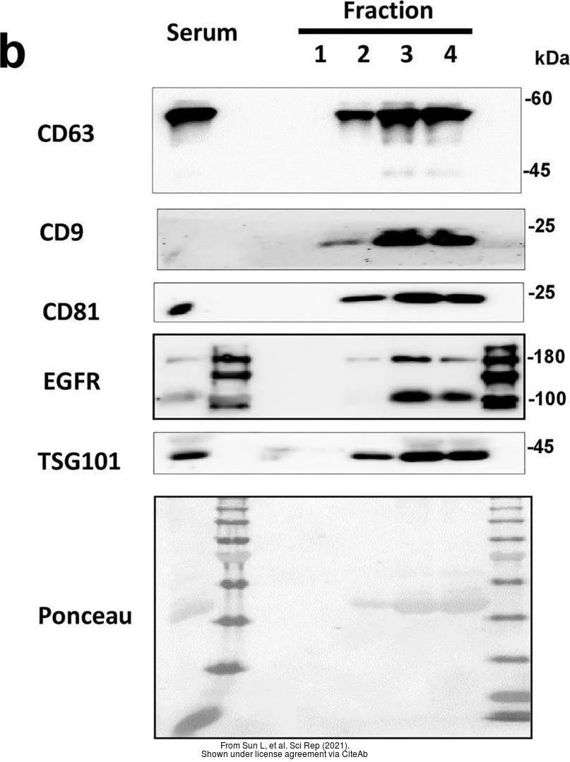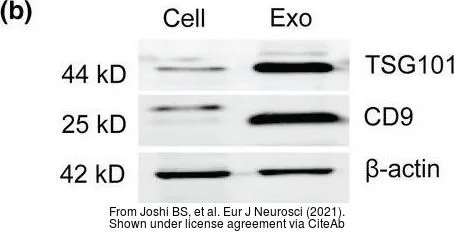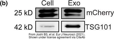 Various whole cell extracts (30 μg) were separated by 10% SDS-PAGE, and the membrane was blotted with TSG101 antibody [4A10] (GTX70255) diluted at 1:500. The HRP-conjugated anti-mouse IgG antibody (GTX213111-01) was used to detect the primary antibody, and the signal was developed with Trident ECL plus-Enhanced.