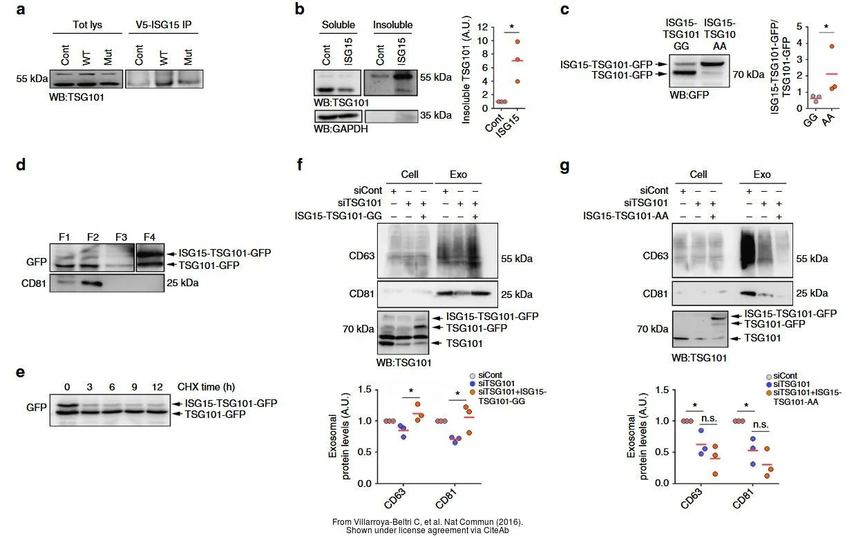 Non-transfected (–) and transfected (+) 293T whole cell extracts (30 μg) were separated by 10% SDS-PAGE, and the membrane was blotted with TSG101 antibody [4A10] (GTX70255) diluted at 1:500. The HRP-conjugated anti-mouse IgG antibody (GTX213111-01) was used to detect the primary antibody.