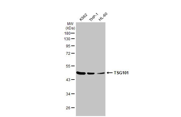 TSG101 antibody [4A10] detects TSG101 protein by western blot analysis.