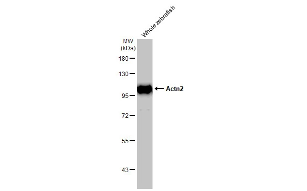 Whole zebrafish extract (30 μg) was separated by 7.5% SDS-PAGE, and the membrane was blotted with alpha Actinin 2 antibody [N1N3] (GTX103219) diluted at 1:1000. The HRP-conjugated anti-rabbit IgG antibody (GTX213110-01) was used to detect the primary antibody.