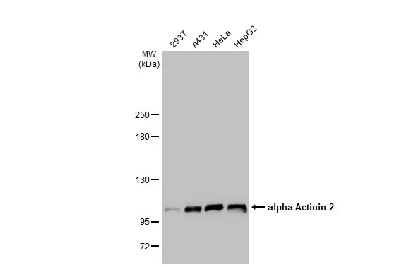 Various whole cell extracts (30 μg) were separated by 5% SDS-PAGE, and the membrane was blotted with alpha Actinin 2 antibody [N1N3] (GTX103219) diluted at 1:1000. The HRP-conjugated anti-rabbit IgG antibody (GTX213110-01) was used to detect the primary antibody.