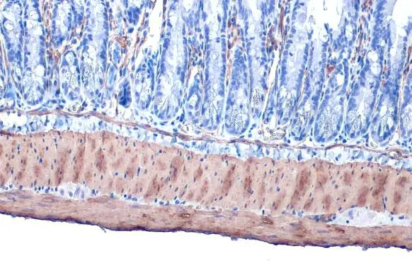 alpha Smooth Muscle Actin antibody detects alpha Smooth Muscle Actin protein at cytoplasm by immunohistochemical analysis.Sample: Paraffin-embedded mouse colon.alpha Smooth Muscle Actin stained by alpha Smooth Muscle Actin antibody (GTX100034) diluted at 1:500.Antigen Retrieval: Citrate buffer, pH 6.0, 15 min