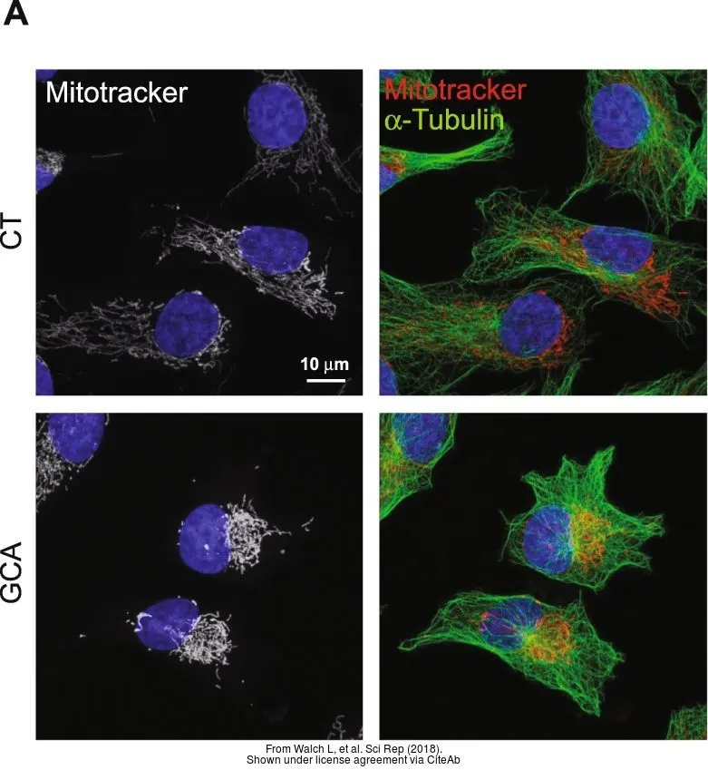 Red: alpha Tubulin antibody [GT114] (GTX628802) diluted at 1:500.