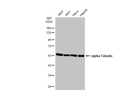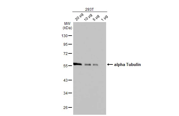 alpha Tubulin antibody detects alpha Tubulin protein by western blot analysis. Varied amount of 293T Whole cell extracts was separated by 10% SDS-PAGE, and the membrane was blotted with alpha Tubulin antibody (GTX628802) at a dilution of 1:10000. The HRP-conjugated anti-mouse IgG antibody (GTX213111-01) was used to detect the primary antibody.