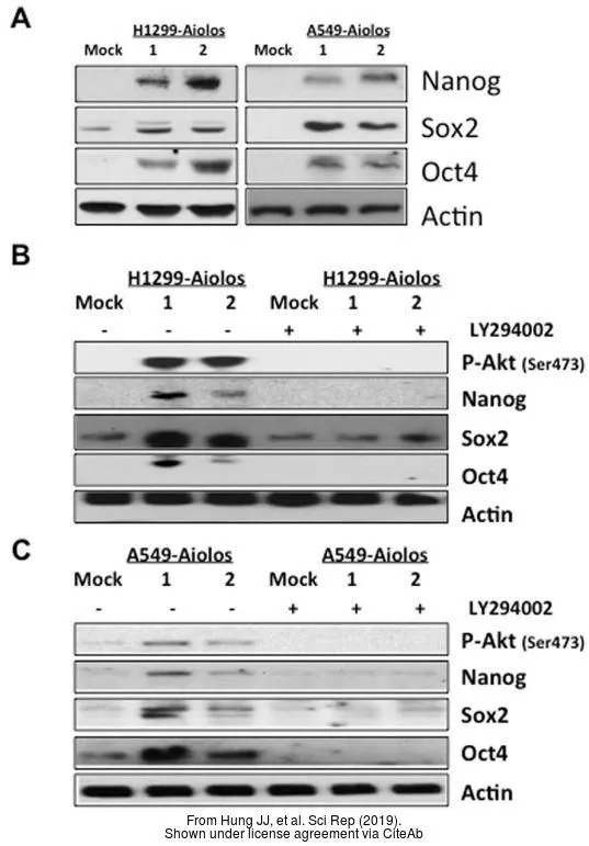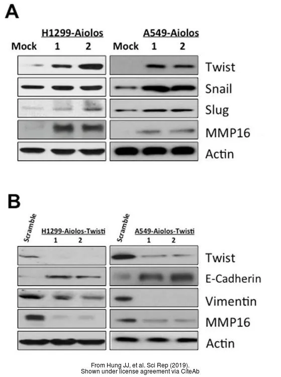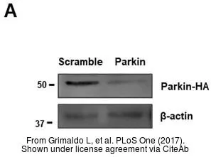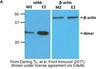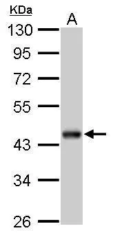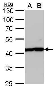 Non-transfected (–) and transfected (+) 293T whole cell extracts (10 μg) were separated by 10% SDS-PAGE, and the membrane was blotted with beta Actin antibody [GT5512] (GTX629630) diluted at 1:20000. The HRP-conjugated anti-mouse IgG antibody (GTX213111-01) was used to detect the primary antibody.