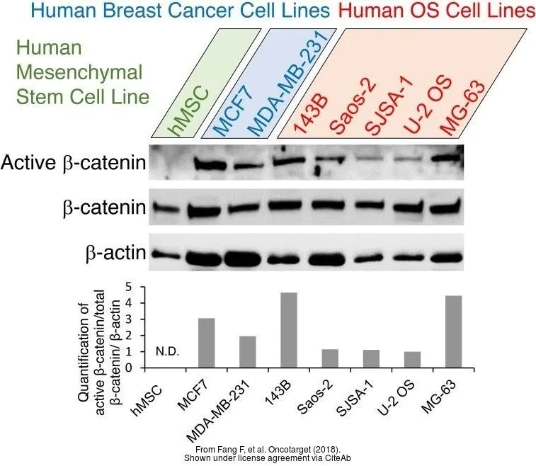Whole cell extract (30 μg) was separated by 7.5% SDS-PAGE, and the membrane was blotted with beta Catenin antibody (GTX101435) diluted at 1:1000. The HRP-conjugated anti-rabbit IgG antibody (GTX213110-01) was used to detect the primary antibody, and the signal was developed with Trident ECL plus-Enhanced.