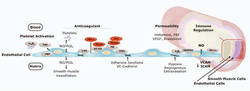 Endothelial cells form the interior lining (endothelium) of all lymphatic and blood vessels. The most fundamental functions of endothelium are to maintain a vessel wall barrier facilitating exchange of molecules between the vasculature and tissues and to regulate vascular homeostasis. Vascular endothelial cells (VECs) and lymphatic endothelial cells (LECs) share features such as flat morphology, apico-basal polarity and several common endothelial cell-specific proteins. As noted above, the primary roles of VECs include the establishment and maintenance of a selective barrier and regulation of blood flow. This entails all aspects of vascular biology in the context of vessel formation and tone, coagulation/fibrinolysis, inflammation, and other pathological processes. VECs interact with platelets and regulate fibrin formation to maintain vascular hemostasis. VECs also modulate immune responses through expression of the T-cell activation inhibitor PD-L1, secretion of nitric oxide, and control of the expression of immune recruiting receptors like ICAM or VCAM. Dysfunction of the endothelium can lead to various vascular diseases and promote the development of chronic conditions that include atherosclerosis. GeneTex is proud to offer an outstanding selection of antibody reagents to study endothelial cells, with an emphasis on VECs. Please see the highlighted antibodies below.