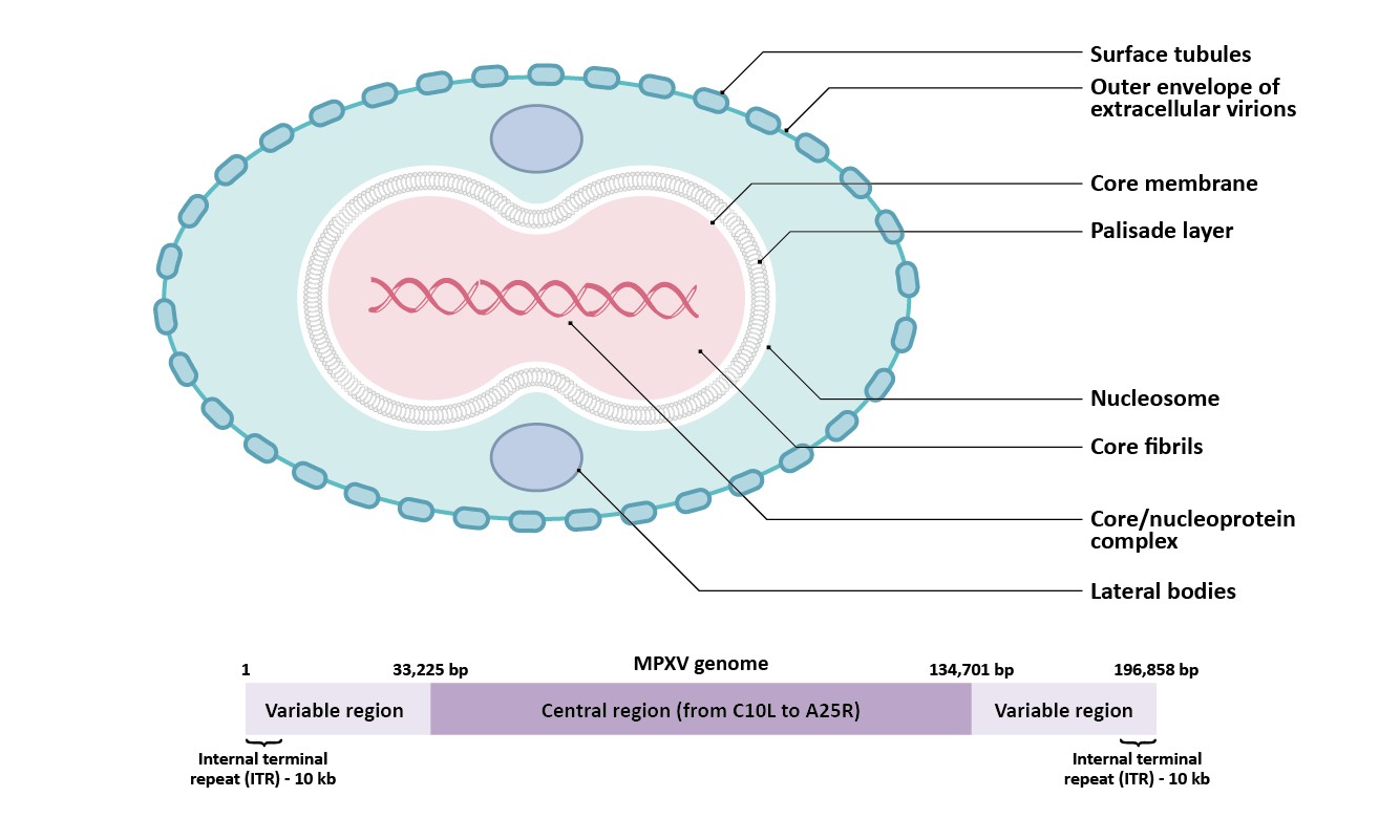 Monkeypox (Mpox) virus (MPXV) is the causative agent of the zoonotic disease known as Mpox, which infects both humans and animals. First detected in monkeys in 1959, the first human case was diagnosed 12 years later. MPXV, an orthopoxvirus in the family Poxviridae, has a brick-shaped or oval morphology and contains a linear, double-stranded DNA of 197 kb encoding ~181 proteins. Its genome consists of a conserved central region, two terminal variable regions, and two inverted terminal repeats (ITRs), which is similar to other orthopoxviruses. The conserved region is responsible for transcription, replication, and virion assembly while the variable regions differ between orthopoxviruses and produce proteins involved in virulence and host range.