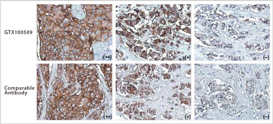 | In another example, slides of human breast carcinoma tissues that express different amounts of HER2/ERBB2 were tested by immunohistochemistry with GeneTex’s HER2/ ERBB2 antibody (GTX100509) and a comparable antibody from another manufacturer. Both antibodies show the expected staining pattern and intensities that correlate with the respective expression levels for each sample. GeneTex antibodies that have been validated using this strategy will be labeled with the icon “ |