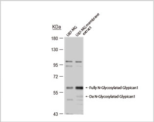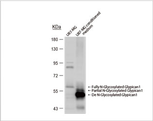 | Similarly, to test the specificity of an antibody against Glypican 1 (GPC1), a glycosylated transmembrane protein known to be cleaved and extracellularly secreted, protein extracts from A431 cells treated with Benzyl glucosinolate and Tunicamycin were used. As shown below, the signals generated by GeneTex’s Glypican 1 antibody (GTX104557) varied depending on the protein’s glycosylation status. In addition, cell membrane extracts and conditioned medium were obtained from U87-MG cell cultures and GPC1 was probed for by western blot. As predicted, the GPC1 signal was enriched in both of these samples, consistent with the protein’s biological characteristics and therefore offering strong evidence of the antibody’s specificity. |